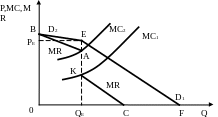 Объединенная кривая спроса изображается ломаной линией, которая состоит из двух отрезков ВЕ и EF (рис.59). Объединенная линия предельного дохода MR тоже состоит из двух отрезков BA и KC, что создаются из двух линий предельного дохода, MR1 (при Q>QE) и MR2 (при Q<QE); объединенная линия MR имеет разрыв по вертикали АК.