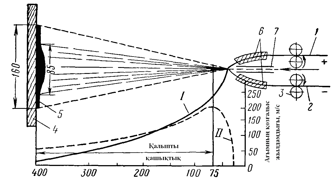 (I қисық) сопладан алыстаған сайын тез төмендейді және 200-300 м қашықтықта тозаңдатылған бөлшектердің жылдамдығынан (II қисық) кем болады. Сондықтае сопла мен бөлшектің бетіне дейінгі қашықтық 75-150 мм болуы керек. Бұл аралықта металл бөліктерінің жылдамдығы ең үлкен, сондықтан тозаңдатылған қабаттың сапасы да жоғарырақ болады.