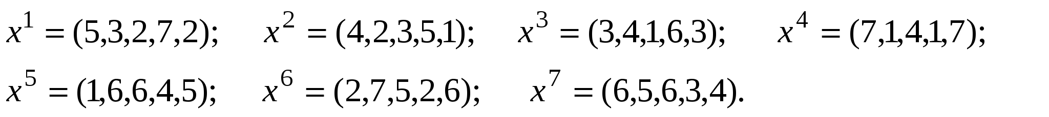 Пусть в исходном множестве альтернативных вариантов, сравниваемых по пяти критериям, определены следующие семь недоминируемых по Парето: