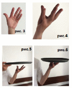 «Рабочей» рукой берем поднос за край – рис. 5, и устанавливаем на кончики пальцев «транспортной» руки – рис. 6 ВАЖНО!!! Рука, держащая поднос способом, должна находиться чуть оставленной от корпуса, на уровне плеча –
