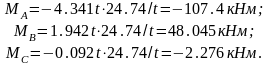 MA=kA∙t= -4,341t; MB=kB∙t= 1,942t; MC=kC∙t= -0,092t;