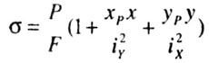 Оси X и Y - центральные (SX = SY = 0) и главные (IXY = 0)оси инерции поперечного сечения. Нормальные напряжения в поперечном сечении от действия силы Р смещенной относительно центра тяжести в точку А с координатами ХP и YP (рис. 7.2, а.б) , определяются по формуле: |