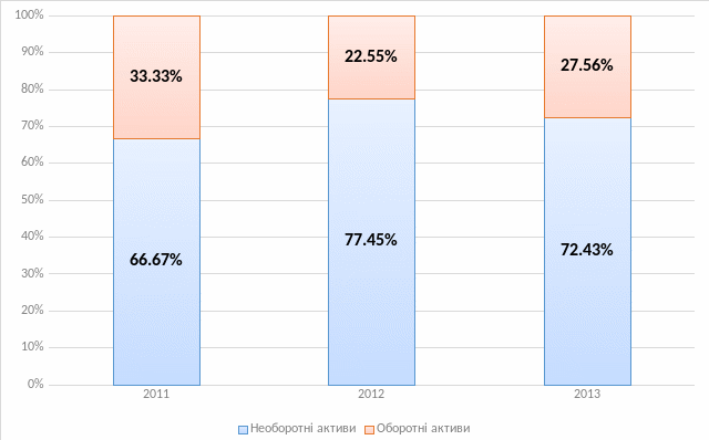 З рис. 1 простежується наступна динаміка: у структурі активу частка необоротних активів у 2011 р. склала 66,67%, однак до 2013 р. зросла до 73,43%. Зважаючи на зростання загального обсягу активів, така динаміка свідчить про підвищення рівня забезпечення підприємства виробничими потужностями, про що свідчить підвищення частки основних засобів у загальній вартості активів з 19,72% у 2011 р. до 57,75% у 2012 р.