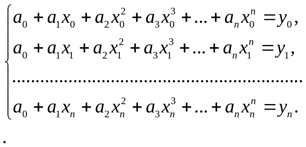 Багаточлен (1.4) буде інтерполяційним для функції (1.2), якщо його коефіцієнти а0, a1, ...,ап задовольняють системі рівнянь