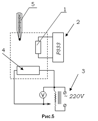 На рис.5 представлена схема лабораторной установки. Терморезистор 1, термометр 5 и нагреватель 4 помещены в закрытый сосуд.
