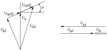Рис. 10. Векторная диаграмма напряжений на диодах дискриминатора и соответствующее ей выпрямленное напряжение на выходе ФД