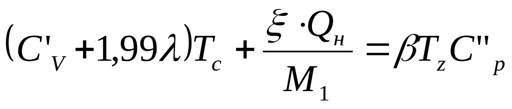 После подстановки значений всех членов, входящих в уравнение сгорания (18), оно примет вид полного квадратного уравнения, при решении которого получится два корня, один из которых будет иметь oотрицательное значение. Этот корень следует опустить, т.к. совершенно очевидно, что температура Tz не может быть отрицательной.