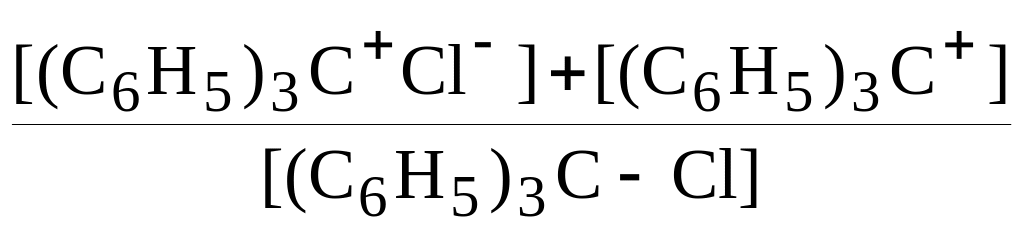 Первую ступень часто называют ионизацией, а вторую – диссоциацией. Для возникновения окраски не нужно полной диссоциации на свободные ионы, нужен лишь разрыв связи C–Cl, ведущий к образованию желтого трифенилкарбониевого иона; sp3–гибридизация узлового атома углерода переходит в sp2–гибридизацию. Поэтому спектрофотометрические измерения могут в принципе дать отношение равновесных концентраций: