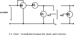 Бос жүріс әдісі 9.1- суретте көрсетілгендей схемамен жүргізіледі. Бірінші ретті орамға номиналь кернеу беріліп бос жүріс тогы, бос жүріс қуаты және екінші ретті кернеу өлшенеді.