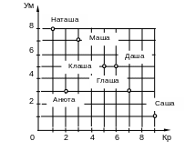 Для быстрой приближенной оценки ограничимся двумя параметрами – умом и красотой. Тогда все кандидатуры могут быть представлены точками в двумерном пространстве.