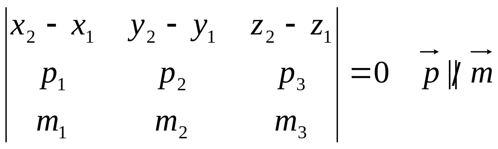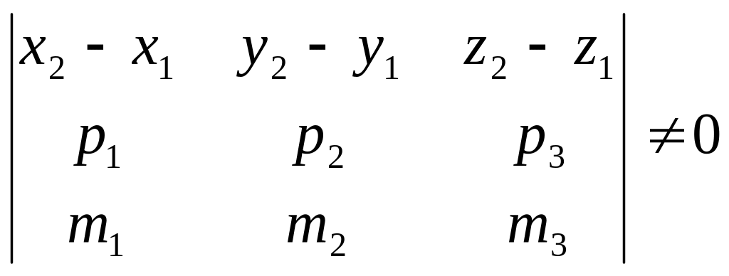 1. Мимобіжні прямі. Це можливо тоді, коли вектори , , не можуть лежати в одній площині, тобто вони – лінійно незалежні, а отже визначник складений з координат векторів повинен дорівнювати нулю.