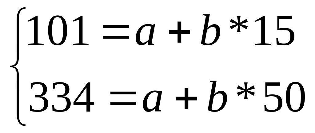 Наприклад, з наведеного масиву значень експериментальних даних, довільно обираємо два значення вхідного фактора: x1 = 15, y1 = 101 - перша експериментальна точка, x2 = 50, y2 = 334 - відповідно друга експериментальна точка.