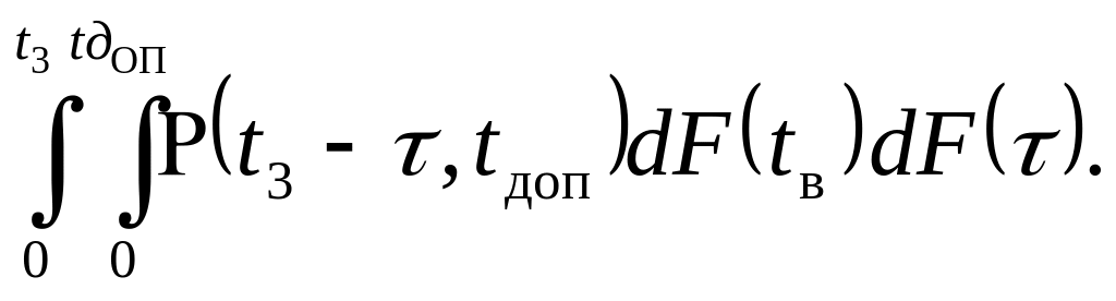 Событие S2 наступает в том случае, если первый перерыв электроснабжения с вероятностью dF(τ) возникает в момент τ<(t — tдоп), восстановление электроснабжения с вероятностью dF(tв) заканчивается через время tв < tдоп и за оставшееся время (tз–τ) с вероятностью P(tз–τ, tдоп ) не наступает опасной ситуации.