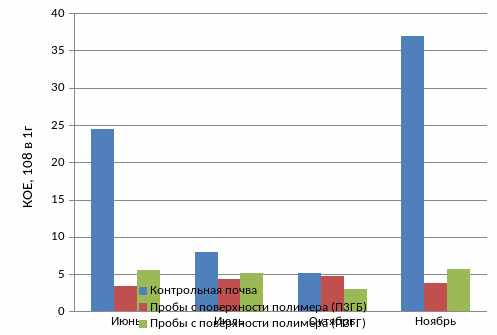 Микробиологический анализ показал, что в контрольной почве количество бактерий на момент отбора образцов в июне и ноябре было значительно выше, чем в июле и октябре, что объясняется погодными условиями – лето было аномально жарким и сухим. Однако на поверхности полимерных пленок общая численность гетеротрофных бактерий варьировала незначительно (рисунок 7, приложение В).