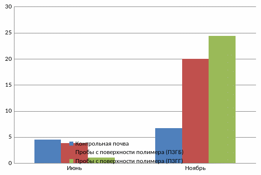 В июне в образцах контрольной почвы и на поверхности полимеров количество бактерий-деструкторов составляло от 1,05 до 4,5×108 КОЕ в 1 г, тогда как в ноябре популяция деструкторов увеличилась на поверхности пленок в 5-20 раз по сравнению с исходной. Это связано с тем, что требуется время для индукции синтеза ферментов, гидролизующих ПГА, и развития микроорганизмов-деструкторов.