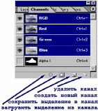 Откроем палитру Channels (Каналы). Кроме цветовых, в ней появился новый канал - Alpha Вспомнив предыдущий урок, вы можете включить/отключить видимость канала, сделать его активным. Работа в этой палитре аналогична работе со слоями. Перевод выделений в каналы и обратно осуществляется через пиктограммы, расположенные внизу палитры.