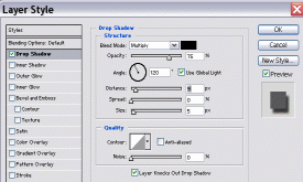 Для применения эффектов необходимо в палитре слоев выделить нужный слой и выполнить команду Слой – Стиль слоя (Layer – Layer Style). Далее в раскрывшемся списке выбрать нужный эффект. Рассмотрим эффект Падающей тени (Drop Shadow).