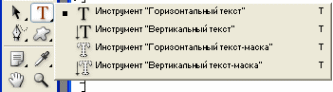 Для ввода обычного текста на панели инструментов выбираем клавишу Т (Type). Под треугольной кнопкой находится список текстовых инструментов: Горизонтальный текст, Вертикальный текст, Горизонтальная и вертикальная текстовые маски. Сначала освоим инструменты горизонтальный и вертикальный текст, текстовые маски рассмотрим позднее.