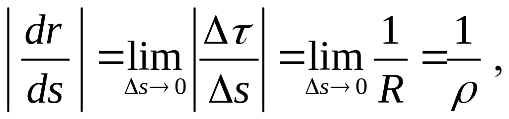 где — предельное значение радиуса окружности, дуга которой в бесконечно малой окрестности точки совпадает с дугой траектории. Эта окружность расположена в соприкасающейся плоскости, построенной для точки . Ее центр лежит на главной нормали и называется центром кривизны траектории в точке . Ее радиус называется радиусом кривизны траектории в точке .
