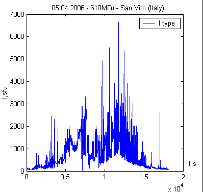 7 суретте Күн радиосигналдарының уақыттық жүзеге асуы көрсетілген. Ордината осі бойынша радиосәулелену ағынынығ тығыздығы, ал абсцисса осі бойынша оқиғаның уақыт (секунд) кезеңі келтірілген.