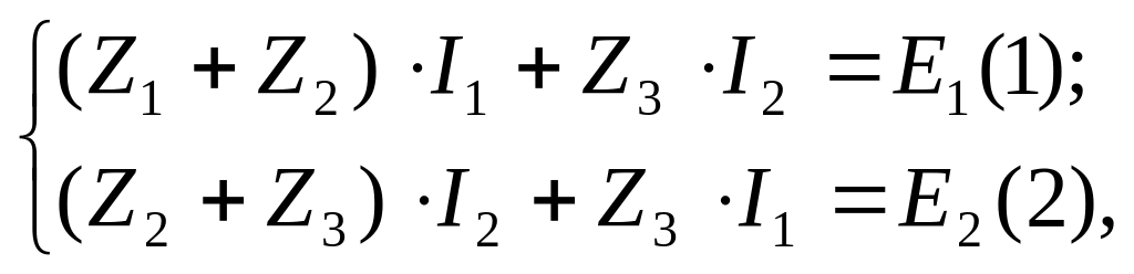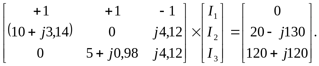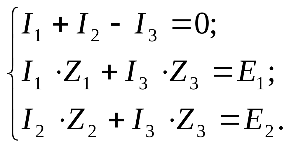 Система складених вище вузлових та контурних рівнянь являє собою систему трьох рівнянь першої степені з трьома невідомими струмами І1, І2, І3 та має вигляд: