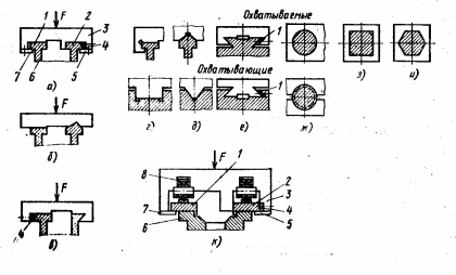 Розрізняють напрямні з силовим замиканням (рис. 10, а) і без силового замикання (рис. 10, б). Охоплювані напрямні (рис. 10, г-и) застосовують при малих швидкостях переміщення, оскільки на них погано утримується змащувальний матеріал, але вони прості у виготовленні і на них не затримується стружка. Охоплюючи напрямні (рис. 10, г, д, е, ж) більш придатні для високих швидкостей ковзання, оскільки добре утримують змащувальний матеріал, проте їх потрібно захищати від стружки і бруду. Переміщатися може як охоплювана, так і охоплююча деталь.