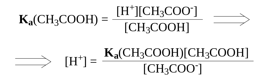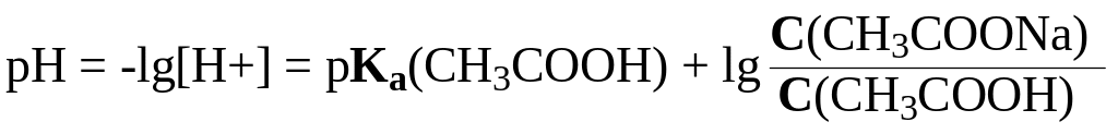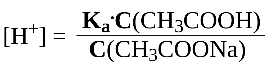 Т.к. степень диссоциации слабой уксусной кислоты значительно понижается в присутствии аниона CH3COO-, а соль как сильный электролит диссоциирует практически нацело, [CH3COOH] и [CH3COO-] можно заменить практически им равными и легко определяемыми величинами C(CH3COOH) и C(CH3COONa).