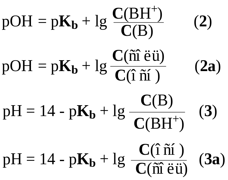 Для буферных систем второго типа B/BH+ гидроксильный и водородный показатели рассчитываются по уравнениям 2, 2а, 3, 3а.