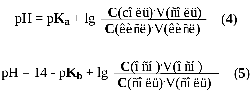 Из уравнений 1-3 следует вывод – величина pH буферных растворов определяется природой кислоты или основания, входящих в состав буферной системы (pKa, pKb) и соотношением концентраций или количеств компонентов. Это позволяет готовить буферные растворы с заданным значением pH смешиванием растворов кислоты и соли (основания и соли). pH этих растворов вычисляют по уравнениям 4 и 5.