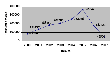 Рисунок 2.2 – Динамика налоговых споров в Арбитражных судах РФ за 2000-2007 гг.* *Источник: Составлено автором на основе данных о налоговых спорах в Арбитражных судах РФ. |