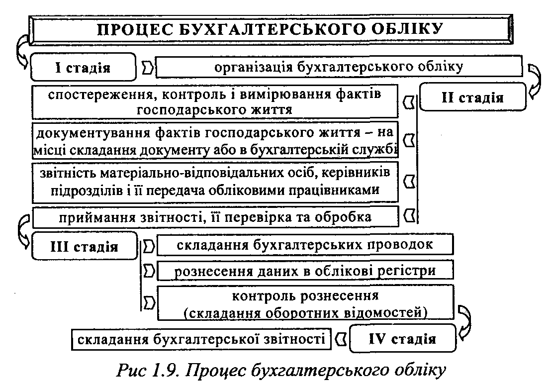 Як процес бухгалтерський облік є логічною послідовністю стадій (стадія - часовий інтервал, протягом якого виконується ряд взаємопов'язаних етапів для досягнення поставленої мети)., які відбуваються у чітко визначеному порядку та не можуть відокремлюватися одна від одної (див. рис. 1.9). У процесі бухгалтерського обліку відбувається обробка отриманих інформаційних даних про факти господарського життя і узагальнення отриманих результатів у вигляді звітної інформації.