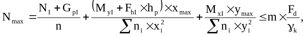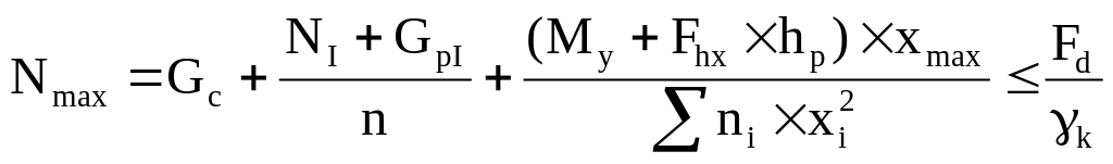 где Gc – собственный вес сваи, кН, с коэф. надежности γf =1,1; NI+GрI – вертикальная расчетная нагрузка, действующая в плоскости подошвы ростверка с учетом веса ростверка GрI и грунта на его уступках, кН; n – количество свай в ростверке; M +Fh×hp – моменты расчетных сил относительно главных осей до оси каждого ряда свай, м; ni – число свай в ряду.