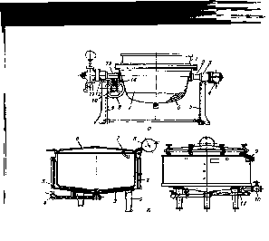 Котел Г2-ФВА (а) с опрокидывающимся резервуаром и рубашкой опирается через цапфы, лежащие в подшипниках, на стойки. К цапфам подсоединены трубы для подвода пара в рубашку и отвода конденсата, поступающего по трубе. На цапфу надето червячное колесо, вращением которого при помощи маховика и червяка поворачивают резервуар.