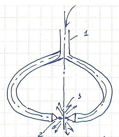 Осуществляется ударная гомогенизация. Молоко поступает в коллектор (1), который разветвляется на 2,3,4 трубки и трубка заканчивается соплом. На выходе сопла формируется скоростная струя молока. Напротив выходного сопла устанавливается пластина (3). Струя ударяется о преграду, разбиваясь на капли. В момент удара происходит диспергирование жировых включений содержащихся в молоке.