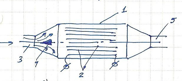 Корпус (1) внутри него установлен пакет пластин (2). Пластины подключены к источнику переменного напряжения. Поток молока поступает через штуцер (3). Для равномерного распределения при выходе установлен обтекатель (4). Под действием напряжения пластины совершают колебания с определенной частотой. Вибрация с пластин передается потоку молока. Расстояние м/у пластинами до 4 мм. За счет воздействия происходит измельчение жировых включений. Молоко выходит через штуцер (5).