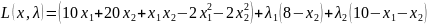 которые совпадают со значениями, найденные в примере 3.2 c использование условий Куна – Таккера. Значения ячеек I6,I7 показывают, что ограничения h1 и h2 выполняются, что свидетельствует о принадлежности оптимального решения области допустимых решений. В ячейке I4 число 80 означает максимальное значение целевой функции.