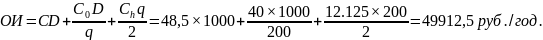 Пример 4.3. Годовой спрос D = 1000 ед., стоимость подачи заказа С0 = 40 рублей / заказ, закупочная цена С = 50 рублей за единицу, годовая стоимость хранения одной единицы составляет 25% от её цены. Можно получить скидку 3%, если размер заказа будет не менее 200 единиц. Стоит ли воспользоваться скидкой ?
