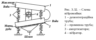 Вібромийка (рис. 3.32) являє собою аґреґат із двох рядів труб 1 і 2, що установлені на амортизаторах 3. Матеріал для промивання разом з водою подається в дезинтеграційні труби 1 верхнього ряду з глухими стінками.