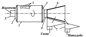 Кут нахилу осі скрубера – 3 – 6º. В обертовий барабан безперервно подається матеріал і вода (ступінь заповнення барабана – 25 %). Для інтенсифікації дезинтеграції матеріалу барабан усередині футерується і армується спеціальними пристроями (виступами) 5, а також у нього завантажують обрізки балок, рейок і т.п. Недоліком скруберів є видача некласифікованого митого продукту. Цей недолік, як правило, усувається з’єднанням скрубера з бутарою 6.