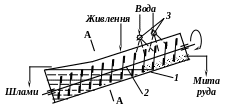 Зерна вугілля, займаючи верхні шари постелі, скочуються через рифлі в поперечному напрямку і розвантажуються уздовж бортів півдек. Порода осаджується в жолобках між рифлями і під дією коливальних рухів короба переміщається до середини деки до відбійного бруса 6, а потім уздовж його до приймального жолоба. В результаті утворюється характерне віяло продуктів збагачення (рис. 3.37).