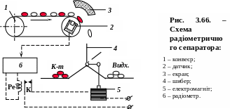 Радіометричні сепаратори обробляють матеріал крупністю від 250 до 0,5 мм. На рис. 3.66 наведена схема одного з найбільш поширених – стрічкового радіометричного сепаратора з розділовим механізмом шиберного типу. Сепаратор складається з стрічкового конвеєра 1, датчика 2, екрана 3, шибера 4, електромагніту 5 і радіометра 6.