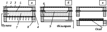 Рис. 4.16. – Схема камери фільтр-преса в режимі фільтрування (а), віджимання (б) і вивантаження (в) осаду.