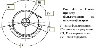 – в зоні просушування ІІ фільтруюча поверхня виходить з пульпи і фільтрат інтенсивно видаляється з осаду. Під дією перепаду тиску через осад просмоктується атмосферне повітря і витісняє останню вологу з пор;