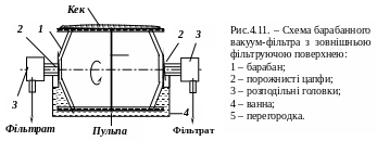 Барабанний вакуум-фільтр з зовнішньою фільтруючою поверхнею (рис. 4.11) складається з барабана 1, порожнистих цапф 2, розподільних головок 3, ванни 4. Вертикальна перегородка 5 ділить барабан на дві ізольовані одна від одної половини. Внутрішня порожнина барабана в радіальному напрямку розділена на секції, кожна з яких з’єднана трубами з розподільною головкою. Фільтруюча тканина на поверхні барабана закріпляється сталевим дротом. Процес фільтрування проходить в описаному порядку.