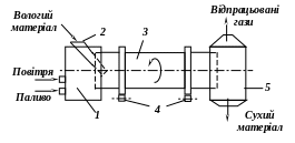 Для сушіння матеріал по завантажувальному лотку 2 подається у обертальний барабан 3, що спирається на котки 4. Всередині барабана установлюють різної форми насадки для кращого контакту матеріалу з гарячими газами. Гарячі димові гази надходять до барабана з топки 1 і рухаються в тому ж напрямку, що й матеріал. Переміщення матеріалу забезпечується обертанням барабана і його нахилом під кутом 3 - 5º до горизонту. Вологий матеріал при русі розпушується, перемішується насадками і висушується від зіткнення з гарячими газами і нагрітою внутрішньою поверхнею барабана. Сухий матеріал видається з барабана через розвантажувальну камеру 5. Відпрацьовані димові гази надходять у систему пиловловлення і після очищення викидаються в атмосферу.