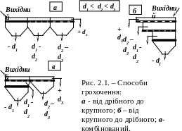 За послідовністю виділення класів крупності розрізняють такі види грохочення: 1) від дрібного до крупного (рис. 2.1 а); 2) від крупного до дрібного (рис. 2.1 б); 3) комбінований (рис. 2.1 в).