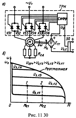 Замкнена схема керування асинхронного ЕП, виконаного по системі «тиристорний регулятор напруги - двигун» (ТРН - АД). Розглянемо схему регулювання швидкості АД з контактними кільцями й зворотним зв'язком по швидкості (мал. 11.30, я). У цій схемі між мережею й статором АД включене тиристорний регулятор напруги ТРН, силову частину якого утворюють три пари з'єднаних паралельно тиристорів VSI... VS6.Керуючі електроди тиристорів приєднані до виходів СІФУ, яка розподіляє керуючі імпульси на всі тиристори й здійснює їхнє зрушення залежно від вхідного сигналу керування Uу. До вала двигуна для реалізації зворотного зв'язку по швидкості приєднується тахогенератор ТГ, ЕРС якого Етг порівнюється з задающою напругою швидкості Uзш.