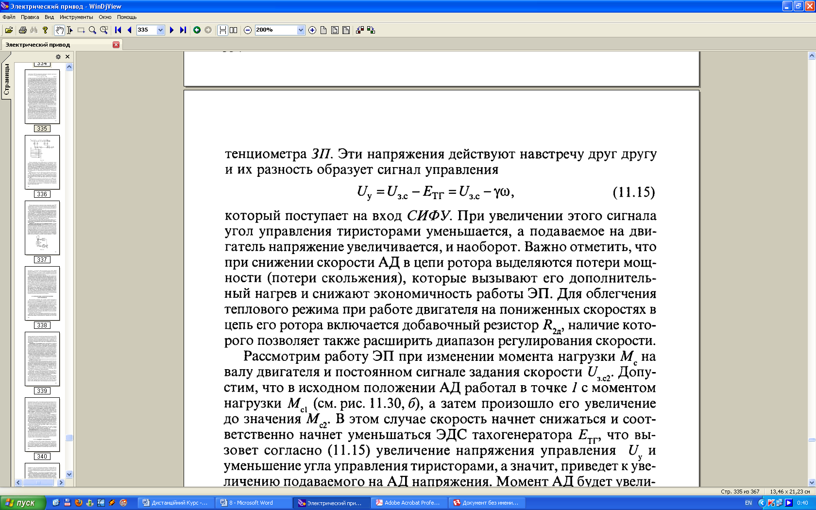 При збільшенні цього сигналу кут керування тиристорами зменшується, а подаване на двигун напруга збільшується, і навпаки. Важливо відзначити, що при зниженні швидкості АД в ланцюзі ротора виділяються втрати потужності (втрати ковзання), які викликають його додаткове нагрівання й знижують економічність роботи ЕП. Для полегшення теплового режиму при роботі двигуна на знижених швидкостях у ланцюг його ротора включається додатковий резистор R2д наявність якого дозволяє також розширити діапазон регулювання швидкості.