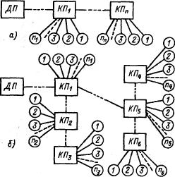 а — ланцюгова; б — деревоподібна; 1, 2 — об'єкти телемеханіки.