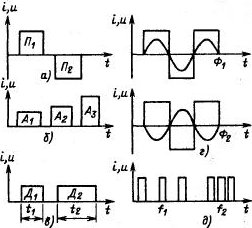 Процес зміни параметра носія інформації відповідно до переданого повідомлення (сигналом) називається модуляцією. Що модулює ( у цьому випадку телемеханічний) сигнал впливає на який-небудь параметр носія (несучих коливань): амплітуду, фазу, частоту. Залежно від модулюємого (змінюваного) параметра носія розрізняють амплітудну, фазову й частотну модуляції. Якщо ж у якості носія інформації служить безперервна послідовність імпульсів, то розрізняють амплітудно-імпульсну, частотно-імпульсну й фазоімпульсну модуляції.